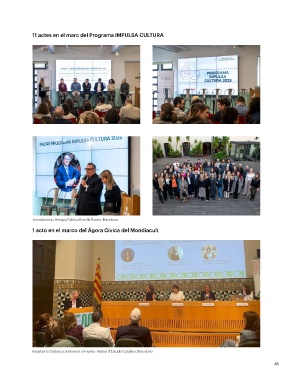 11 actes en el marc del Programa IMPULSA CULTURA Jornada inicio, Antigua Fábrica Estrella Damm, Barcelona 1 acto en el marco del Ágora Cívica del Mondiacult Impulsar la Cultura, transformar el mundo. Institut d’Estudis Catalans, Barcelona 45