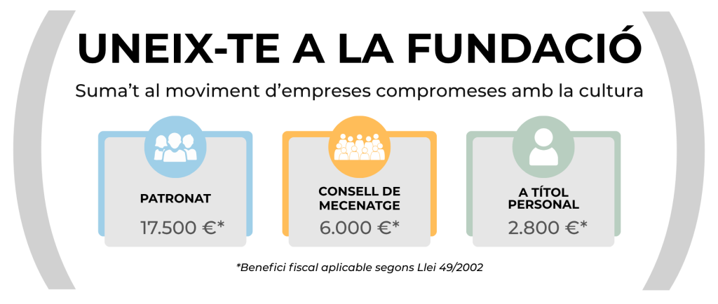 - Participaràs i col·laboraràs en actes que organitza la f ( ), amb la qual cosa tindràs visibilitat com a organització privada que col·labora activament amb la f ( ) i formaràs part de les empreses capdavanteres que contribueixen al desenvolupament i la difusió de la cultura dins el nostre territori.
